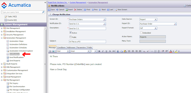 Please note, Screen ID should be Purchase Order, since we want changing of the status in THIS screen to trigger a notification event. In the Message body I want to be mentioned that system should include actual PO number that was created, so I use standard Template Notification syntax of ((fieldname)). I also want actual PO Form to get attached to my e-mail, so user can review it, I just added Data Source: Report with format PDF.