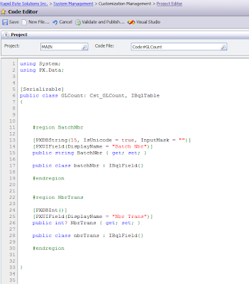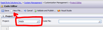 2. Next step is to create a Data Access Class in Acumatica App that will represent that View for our report. System Management->Customization Management->Code Editor, select any project you with to add that DAC. If you have not started customizing your Acumatica yet, just create a new customization project and save it to database before this step. I selected MAIN project, then click New File: