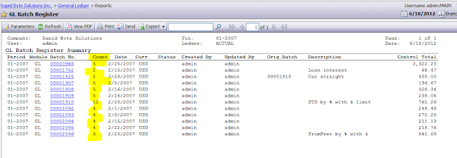 For example let's modify a Batch Register report from General Ledger. It has summary information, but I want to see the number of transaction lines per each batch. Well I am sure it is possible to do it just inside a report without adding any view, but just for training purpose lets do it our way.