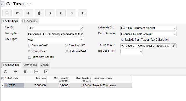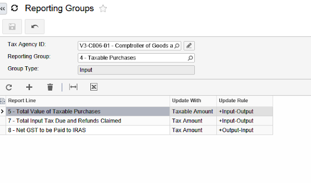 In Acumatica ERP we are going to setup TAX module based on IRAS guidelines. Final Tax report should look based on above requirements.